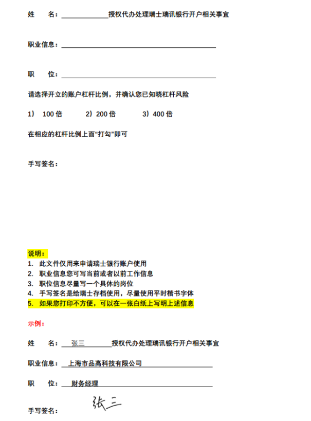 ”本人***(姓名)授权代办处理瑞讯银行开户相关事宜。资料真实有效”